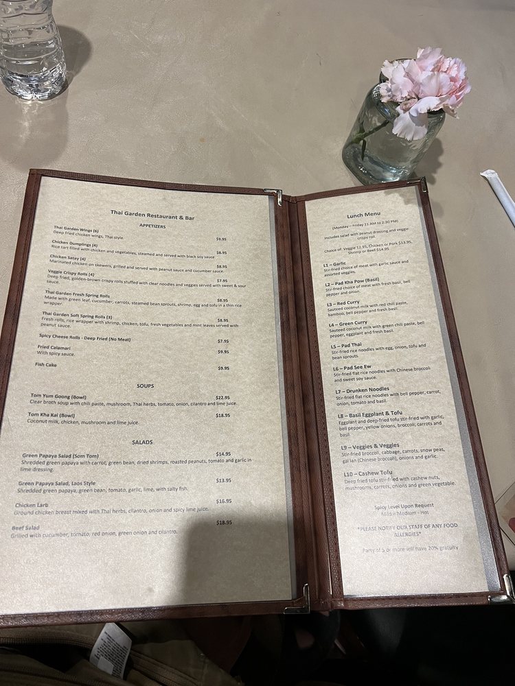 Welcome to Thai Garden Restaurant & Bar, a delightful haven for Thai cuisine located at 6324 Richmond Ave, Houston, TX. This charming venue offers an array of culinary delights that showcase authentic Thai flavors. The menu features a variety of Noodle Soups, including Beef & Chicken Noodle Soups, along with vibrant Noodle Dishes like Drunken Noodles and Pad Thai, all reasonably priced around $15.95.